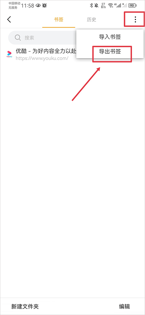 2、书签就是收藏夹,里面放置着我们收藏的网页页面,若需要备份可以点击右上角三点,并选择导出书签