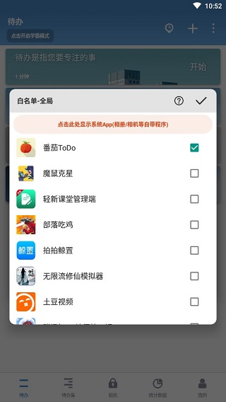3、由于开启学霸模式之后,番茄钟就会禁止打开其他的软件,大家还可以通过“学霸模式白名单”功能勾选应用,避免误拦截的情况。