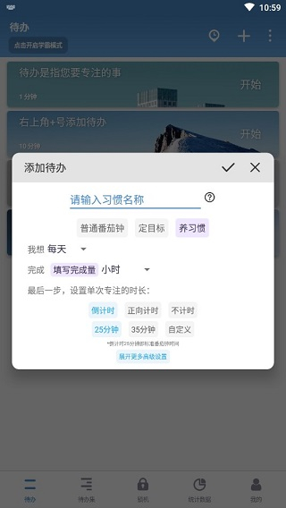 第六式:番茄钟结合习惯养成功能,可规定每天,每周,每月的专注时长目标,融入一万小时理论让专注更加高效