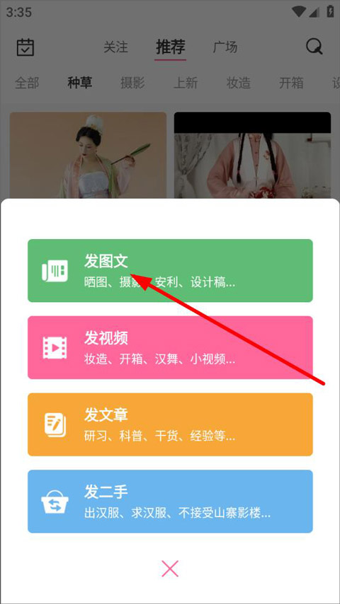 2. 进入发布页面后,用户能够进行多种内容的发布,包括图文(如晒图、摄影、种草、设计稿)、视频(像妆造、开箱等)、文章(例如研习、科普、经验等)以及二手闲置(包含出物、求物等)。此时,点击发布图文。