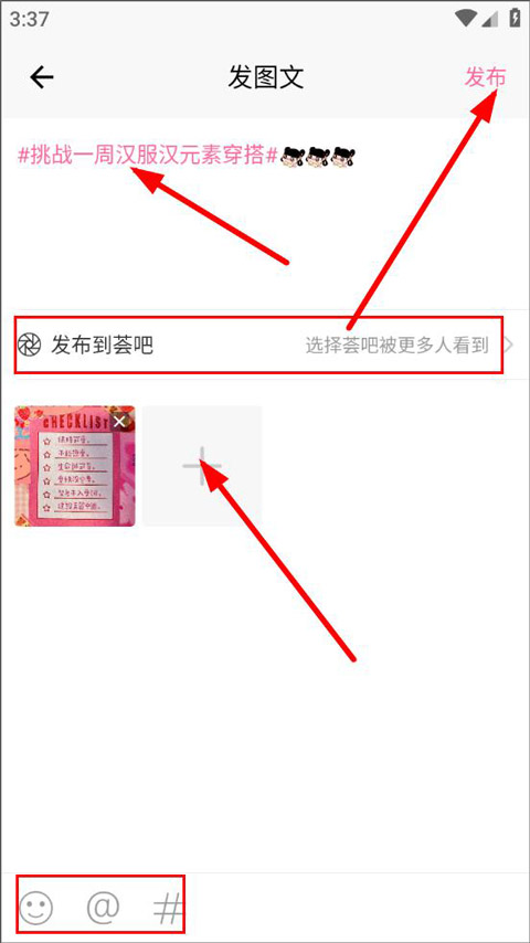3、发布图文时,先挑选要发布的照片或视频,接着输入文案,在下方还能添加表情、话题,设置好发布范围后,点击“发布”就能成功发布动态。