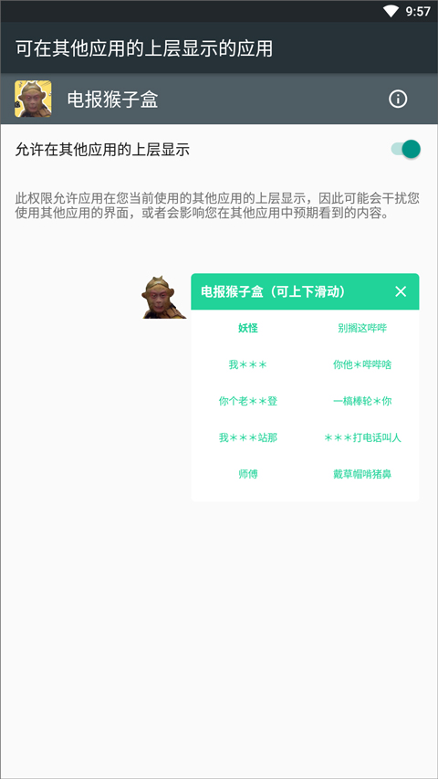 此外,电报悟空盒具备悬浮窗模式。玩家只要开启应用的悬浮窗权限,再点击小开关,就能启用该模式。如此一来,在 QQ 聊天时就能进行变音恶搞,体验感极佳。感兴趣的朋友不妨下载体验一番,相信定会让你满意。