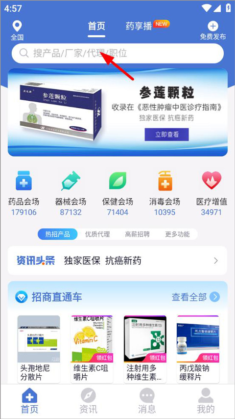 1、用户登录药脉通app,选择代理身份后进入软件主页。在此页面,用户不仅能够搜索产品、厂家、职位等信息,还能查看药品会场、器械会场等。若要查找相关内容,点击上方搜索框并输入即可。