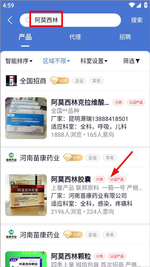 2、在输入产品名称进行搜索后,用户能够看到与之相关的产品企业,挑选合适的产品并打开即可。