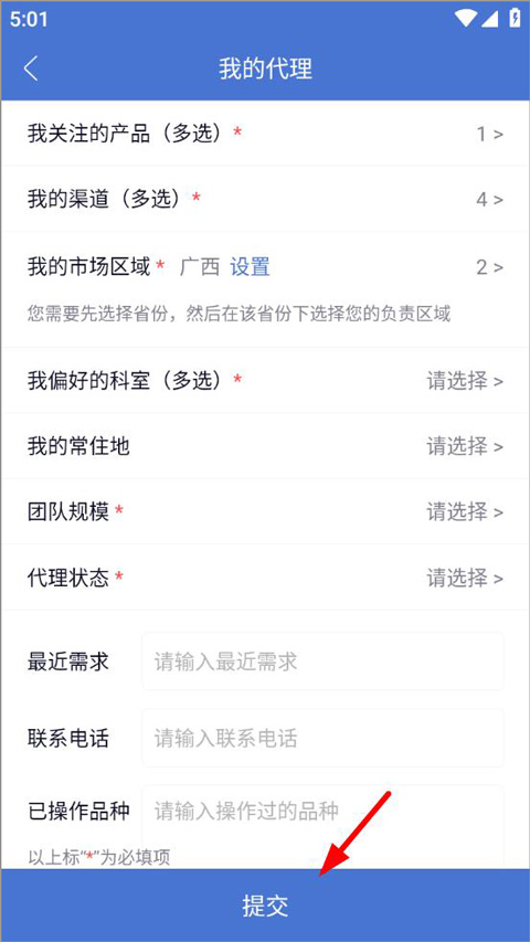 4、来到我的代理发布页面,用户依据自身需求填写产品、渠道、市场区域、科室、团队规模等信息,填好后点击提交,就能查找相关产品。