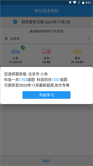 2、然后应用就会根据所选择的城市和车型智能地推荐最新的题库供用户学习