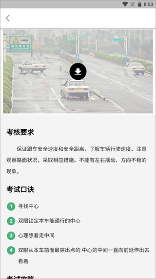 6、学车视频:专为学员精心打造的科目二、科目三考试高清视频。建议先观看视频,再进行实际操作。通过观看视频,能熟悉机动车运动轨迹,让您心里更有把握,考试时不再心慌。