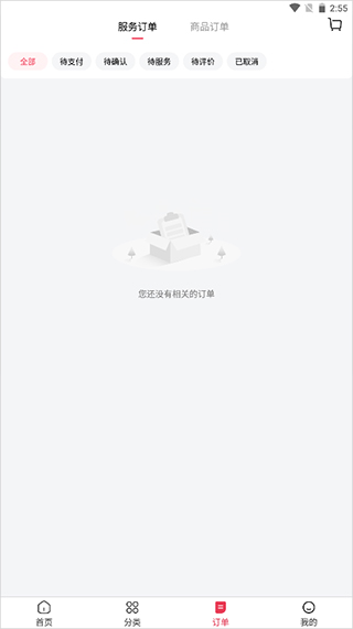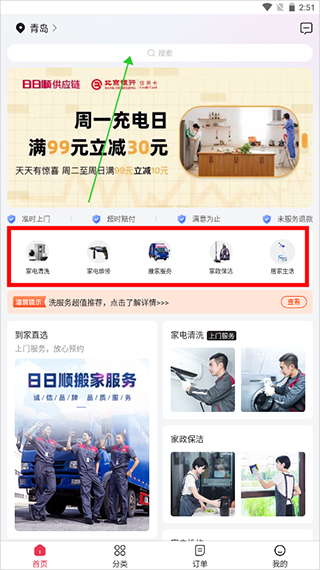 1、用户打开应用并完成登录,进入首页后,既能够通过顶部搜索框,也可以点击下图红色方框标注的服务项目,以此来预约服务。