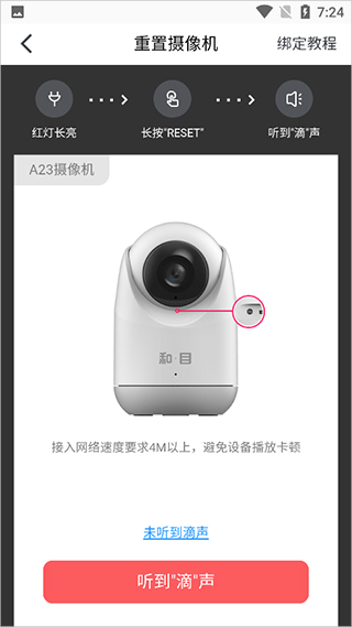 3、在打开的新页面上,依据操作说明保证设备指示灯状态正常。当听到“滴”的一声后,点击红色按钮。要是没听到声音,有可能是摄像机未成功重置,此时用户需再次确认摄像机已接通电源,指示灯亮起。也可以再次尝试长按“RESET”键5秒,直至听到“滴”声。倘若还是不行,可前往当地营业厅寻求协助,或者拨打客服热线:400 - 110 - 0868。