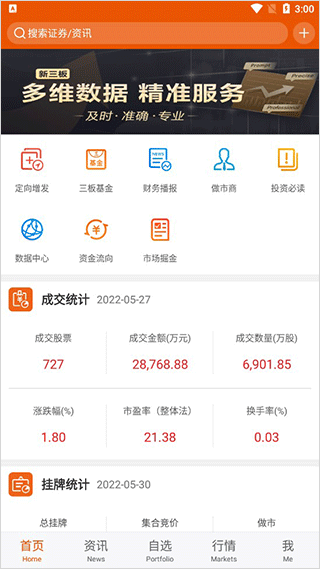2、进入软件后,在首页就可以看到:定向增发、三板基金、财务播报等。