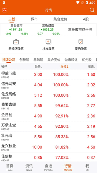5、在“行情”,可以了解到:三板、做市、集合竞价等。