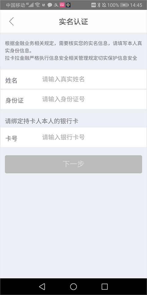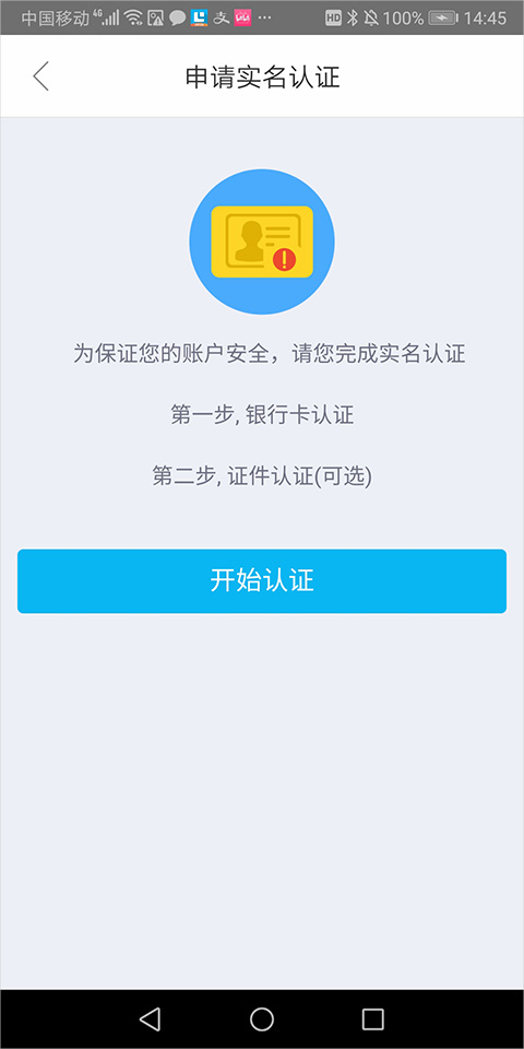 当用户在本站完成该应用的下载后,在手机上进行安装并打开登录。登录成功后,手机屏幕会弹出提示需实名认证的窗口信息。用户点击实名认证选项后,将会呈现如下页面,在该页面中,点击【开始认证】按钮即可。