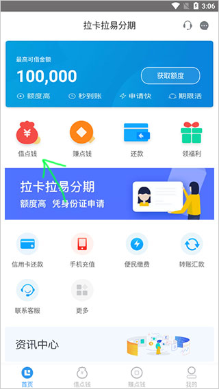 完成视频验证审核后,就能开展信贷业务。这时,用户只需在首页点击【借点钱】,然后从【工薪贷】和【生意贷】中选择其一,便可进行贷款操作。