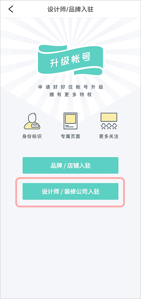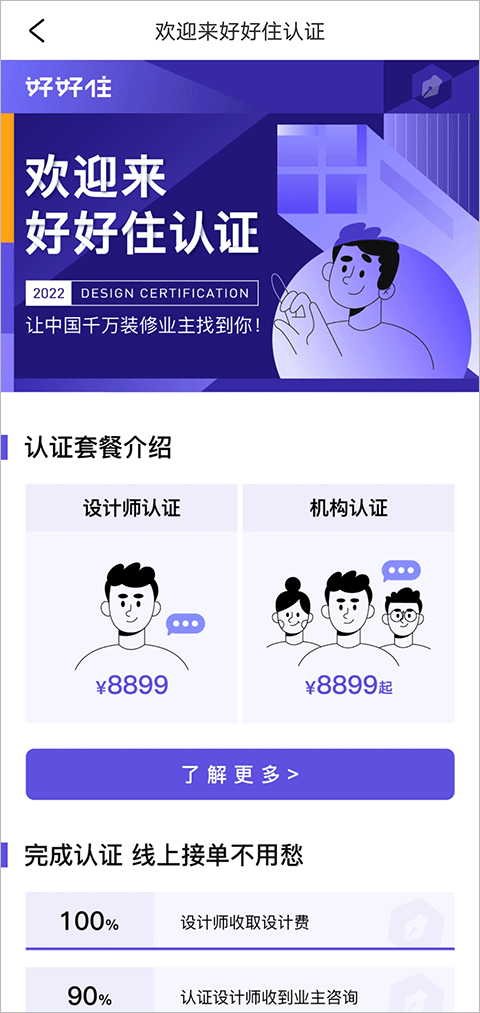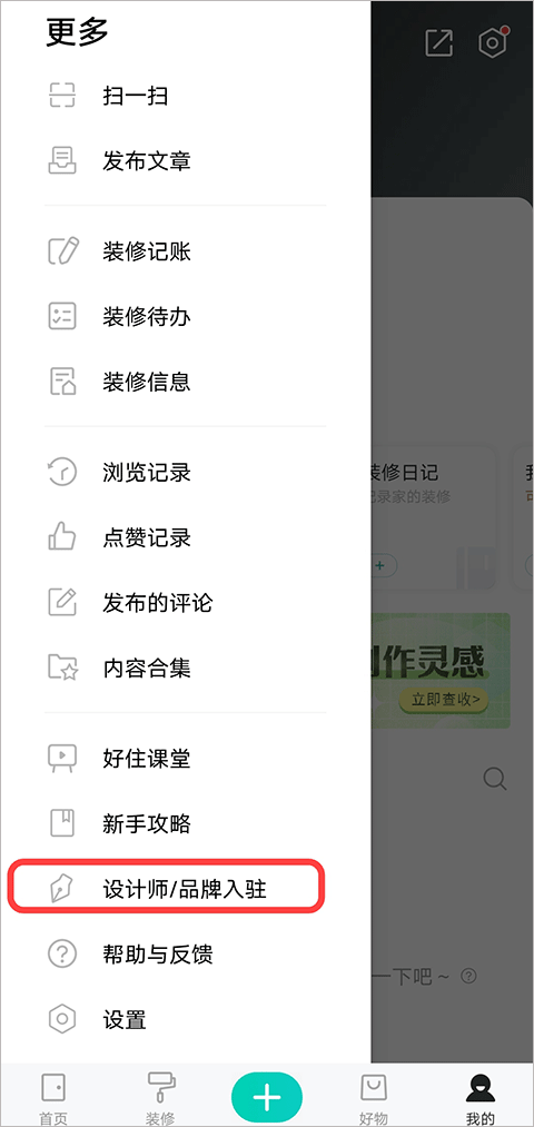 您好,打开好好住 APP ,进入「我的」页面,点击左上角「更多」选项,接着点击「品牌/设计师入驻」,然后选择您要申请认证的身份,就能进行线上申请啦。
