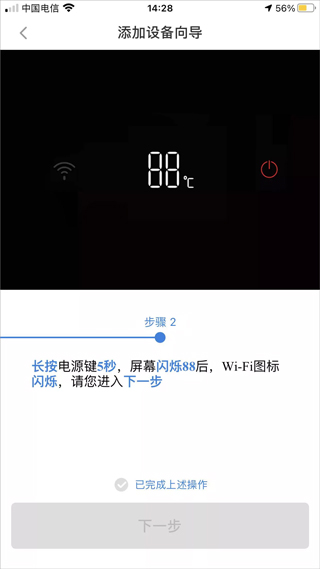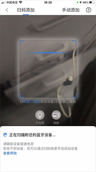 第二步:扫机身二维码添加设备,且在机器关机状态下,长按机身电源键5s后,Wi-Fi图标闪烁。