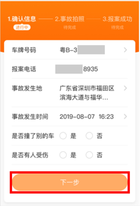 第二步:如实填写事故信息后点击“下一步"按钮