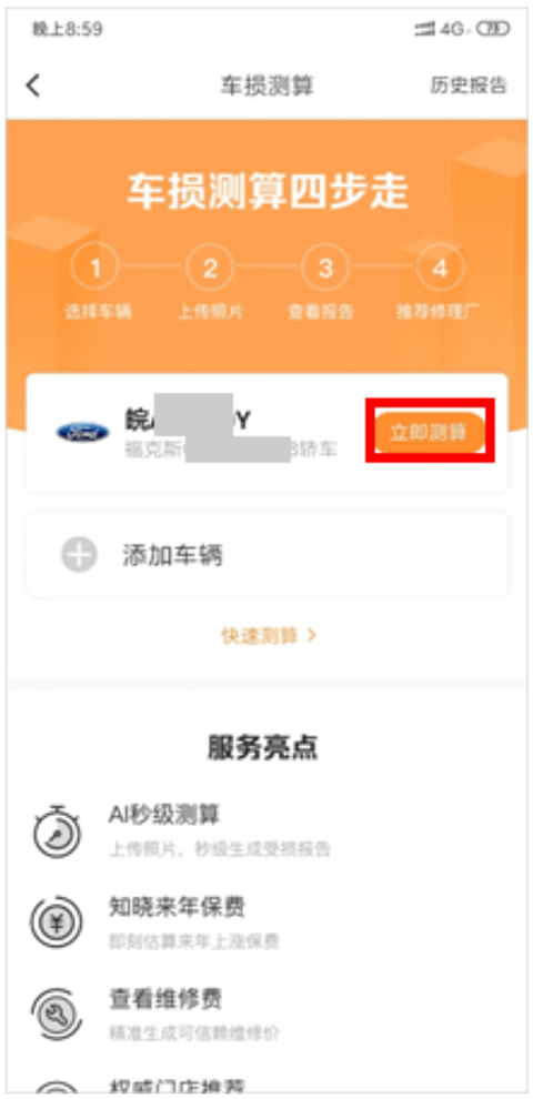 第一步:进入办理赔首页,点击“车损测算"按钮