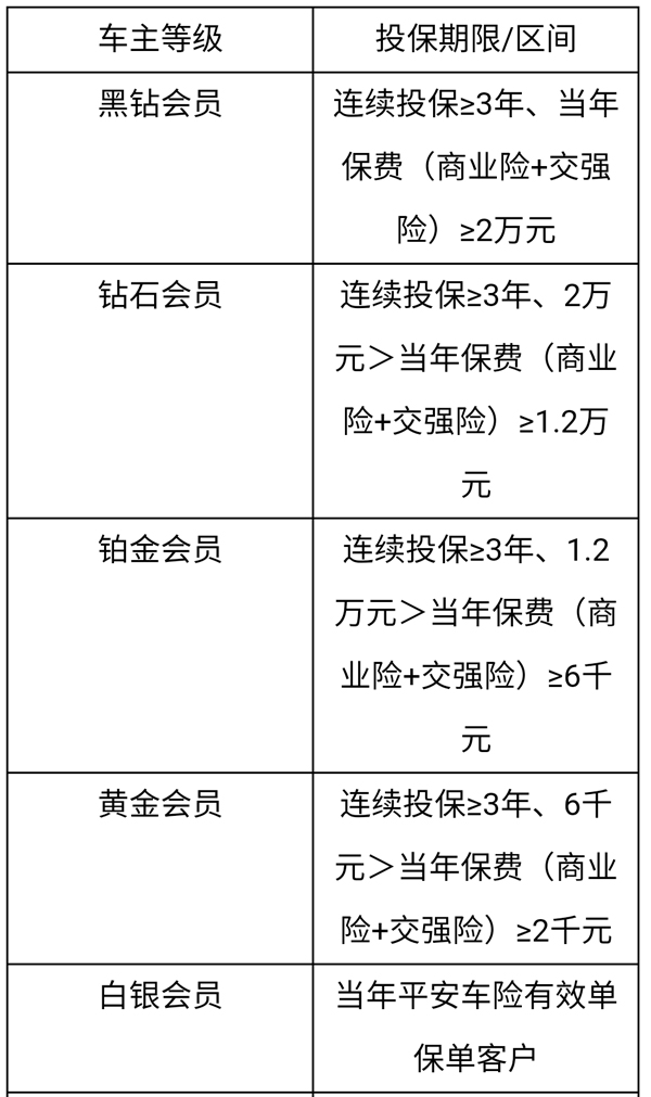 注:白银及以上会员为车险会员,根据车险投保金额及续保年限来确定相应等级