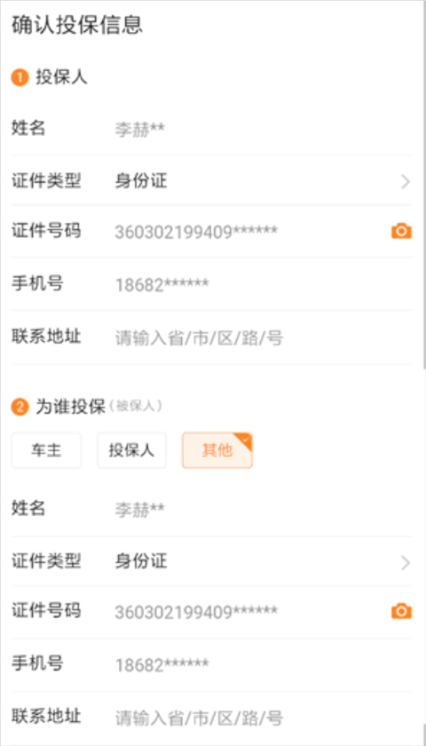填写信息后可以获取报价结果,如报价成功,页面会展示报价结果,您需要再确认投保人、被保人信息,并补充配送地址