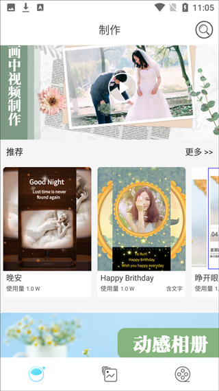 用户使用软件的视频拍摄功能,能迅速录制想编辑的视频,录制完毕即刻进入编辑中心。编辑时可随时播放预览效果。每次编辑前,都可在平台浏览最新的视频特效模板,观看模板视频时,点击拍摄同款,就能把特效应用到自己的视频里。