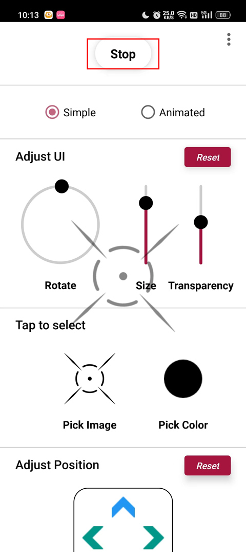 4、最后在“adjust position”里调整准星在屏幕中的位置,建议选择右上角的“reset”。
