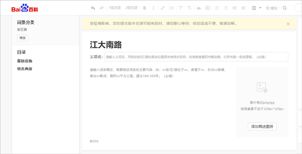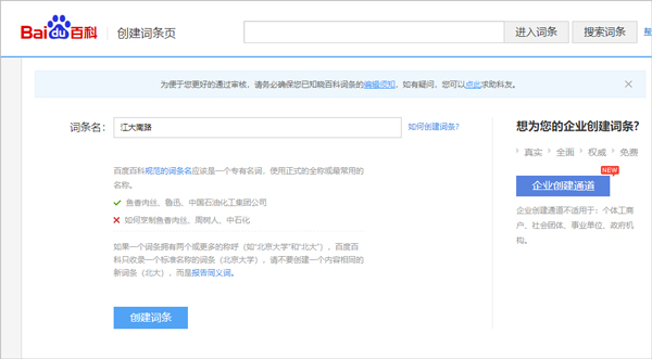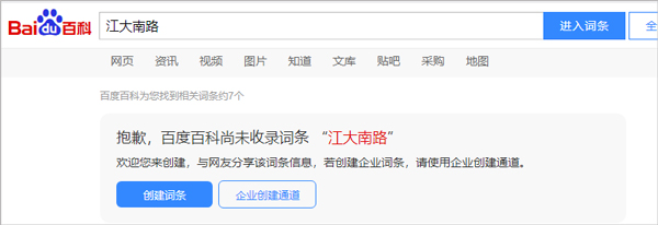 2、倘若该词条的确还未被百科收录,你能够在搜索结果页面或者百度百科首页点击“创建词条”,来创建此词条。比如能够创建“江大南路”这个词条。