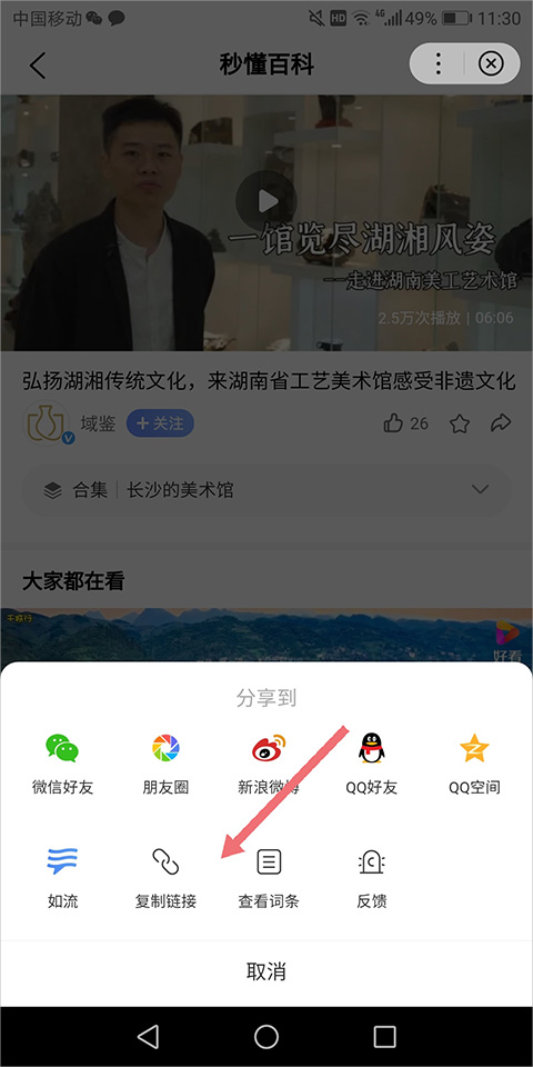 1、首先进入百度百科app的秒懂视频,选择一个视频点击进去,在视频播放页面的底部右侧有个分享小图标(下图红色箭头所指区域),用户点击这个小图标