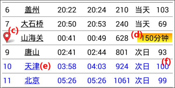 (e)蓝色字体的车站表示车次的运行区间。如:查询“天津”到“北京",两站之间所经过的车站均为蓝色