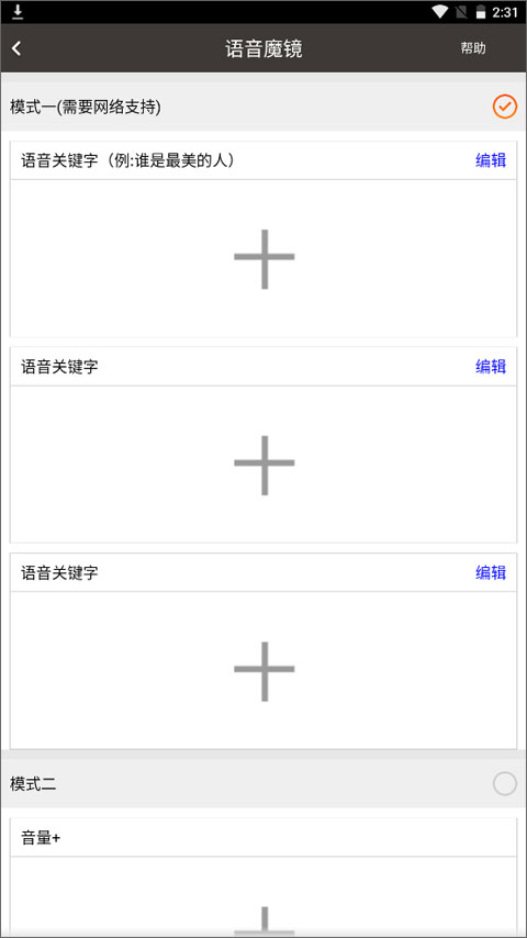 请先进入设置界面,在其中录入语音以及与之对应的照片。完成录入后,重新启动《语音魔镜》应用程序。启动后,说出一段语音,在说完语音后,按下音量的上、下键,此时便会显示出与该语音对应的图片。