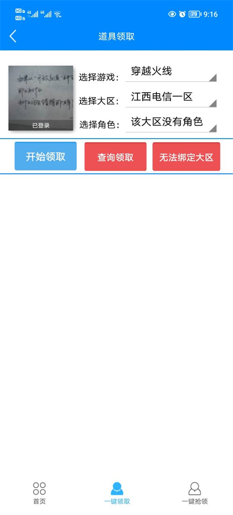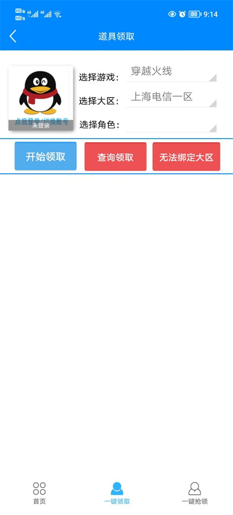 2. 完成登录后,选择大区与角色信息,接着点击开始领取。