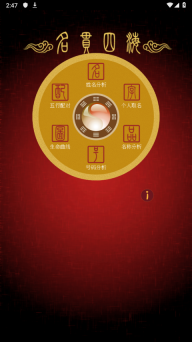1、于本站免费下载并安装该软件的官方版本,安装完成后打开进入。此时,可看到界面中八卦阵的铜钱上设有六个功能,分别为姓名分析、个人取名、名称分析、号码分析、生命曲线以及五行配对。