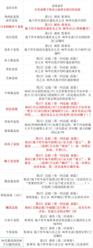 获取方式:详细内容见下方表格,其中红色加粗字体所标识的盒饭,在流程中会错失。实际达成成就/获得奖杯的时间,是在第3日调查地下停车场,与市之谷响华对话结束之后。