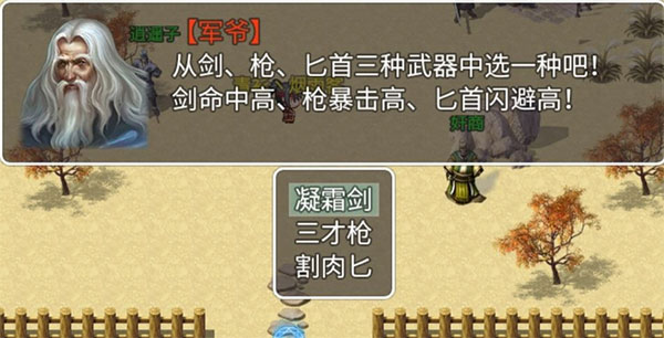 首先,前往军爷处领取开局武器。这里有三种初级武器供你挑选,分别是枪(具备暴击属性)、剑(拥有命中属性)以及匕首(带有闪避属性)。