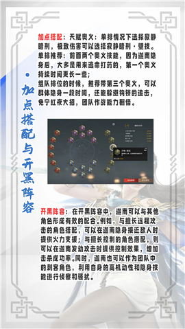 迦南的技能大多围绕着位移与隐身进行设计。关于技能加点,推荐优先强化位移技能,借此提升迦南的灵活度与生存几率。此外,隐身技能同样是迦南的关键技能之一,可酌情升级,以此延长隐身时长并增强隐身效果。在战斗时,需巧妙运用这两个技能,迅速靠近敌人并给予致命一击。