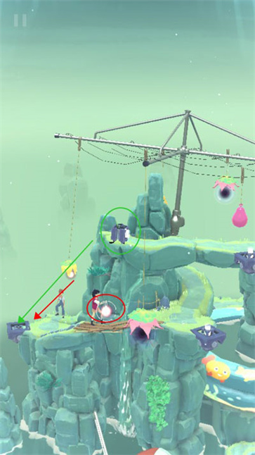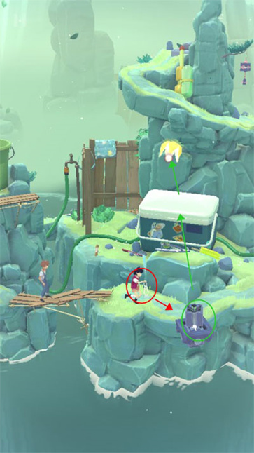 4、借助亮着的提灯唤醒桥梁,以便继续前行,此时前方的【灯座】会再次出现。首先让T前往前方拉动风铃,关闭水桶中对应的黑莲花,接着让A把提灯放置在【灯座】上,随后继续前进,【灯座】会朝着黄莲花的方向去点灯,直至【灯座】再次停下,这时让A取走亮着的提灯,前往终点点灯。