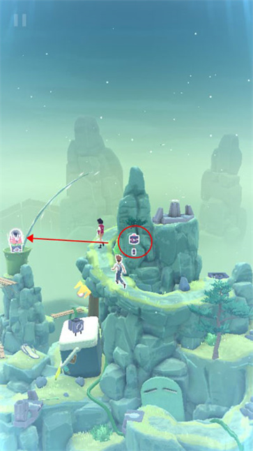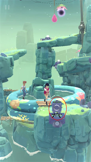 5、在第二小节,我们先向前走,在桥梁前将提灯放置到跳过来的【灯座】上,随后返回。当【灯座】接触到黄莲花并被点亮时,继续前行,拿起亮着的提灯通过桥梁。