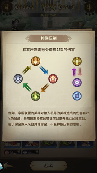 3、种族克制:各英雄所属种族间存在克制关联,一旦形成克制,能额外造成25%的伤害。记住这个小窍门,关键时刻或许能扭转对战强敌的局势。在战斗开启前,轻点英雄栏右上角的感叹号图标,就能查看具体的加成信息。