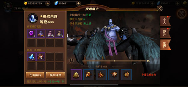 世界领主由全体玩家共同击杀,每位玩家每日有3次挑战机会。世界领主被击败后,次日会重新刷新。当领主被击败时,将依据对其造成伤害的排名来结算排名奖励。给予世界领主最后一击的玩家,能够获取额外奖励。每次挑战都能得到精炼石、坐骑装备碎片等珍贵道具奖励。