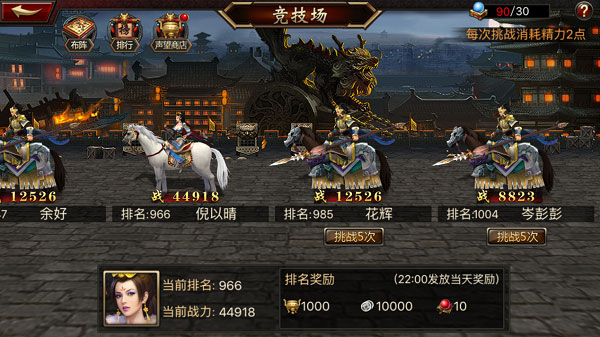 三国群英传争霸360版里,竞技场是最早开启的PVP玩法。在这里,你能与其他玩家相互挑战,在切磋武艺的过程中,努力获取更高的排名。