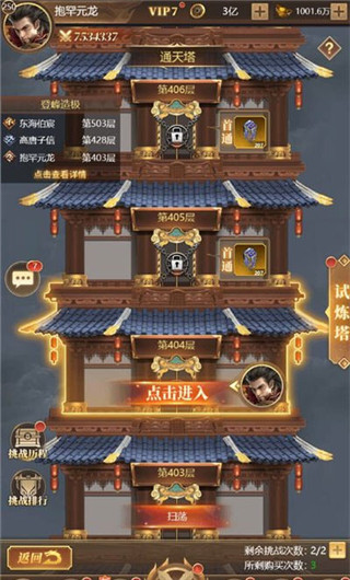 2、未通关的挑战层数不耗费次数,已通关的层数能够扫荡。每天有2次免费扫荡机会,还能用元宝购买,最多额外购买3次扫荡次数。