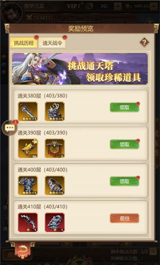 1、通天塔首次通关可获得进阶石奖励,每10层额外获得通关奖励。