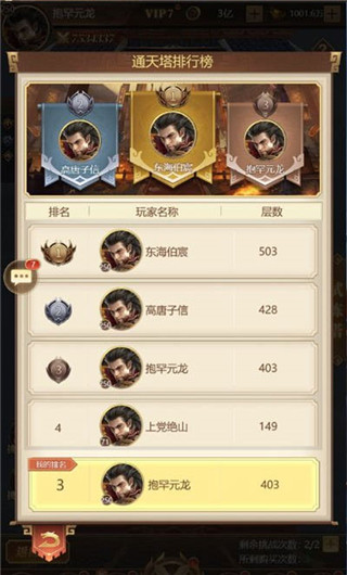 排名:玩家可在通天塔页面看到同服其他玩家爬塔排名情况。
