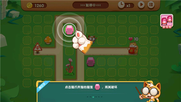 自由路径关卡:没有固定的路径,怪物可以在场景中自由寻路,在地图中放置猫咪可以阻挡怪物前进。