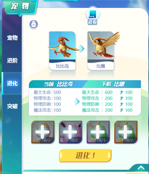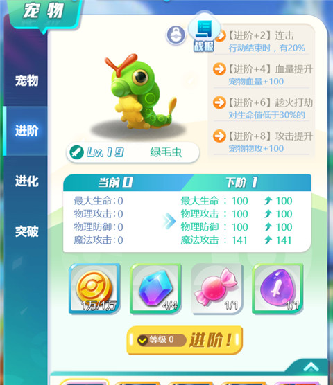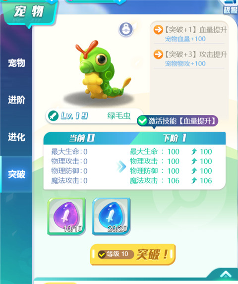 突破可以激活提升宠物的属性技能加成。只要达到了突破要求,所有伙伴都可以通过消耗材料进行突破。