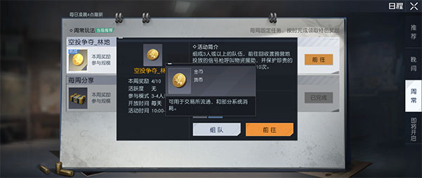 在日程 - 周常的空投争夺_林地活动中,参与者可获得金币奖励,每一轮能得到300金币,10轮就能积累3000金币,这笔金币能够购买一些紫色武器。金色装备的购买成本相对较高,但装备后淘汰速度会延缓两个阶段。若不追求排行榜名次且想节省金币,珍品装备并非推荐的追求目标,毕竟在训练赛里,不同品质装备之间的差距会有所缩小。
