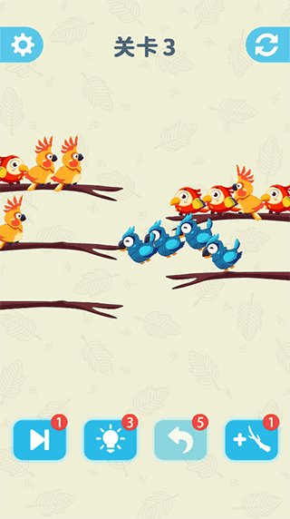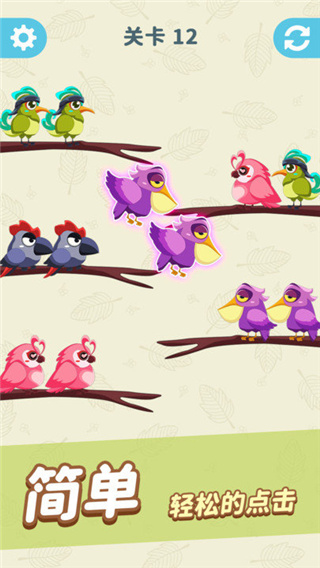 1. 打开游戏,接着点击颜色相同的鸟,使它们一同飞到同一根树枝上。