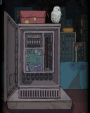 3、地上捡起玻璃瓶,电箱上面有一只孵蛋的猫头鹰,等下回来找他。