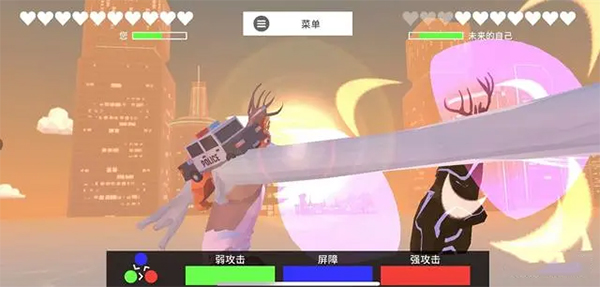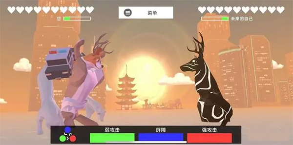 在《普通的鹿》这款游戏的未来版本中,最终的决斗形式便是如此。玩家需与敌方展开一对一的决斗,决斗方式共有三种,即强攻击、弱攻击以及屏障。屏幕上方的绿色条为能量条,只有当能量条完全攒满后,方可释放一次攻击。这三种攻击方式相互制衡,具体表现为:强攻击能够打破屏障,弱攻击凭借较快的攻速可以命中强攻击,而屏障则能够抵挡弱攻击。