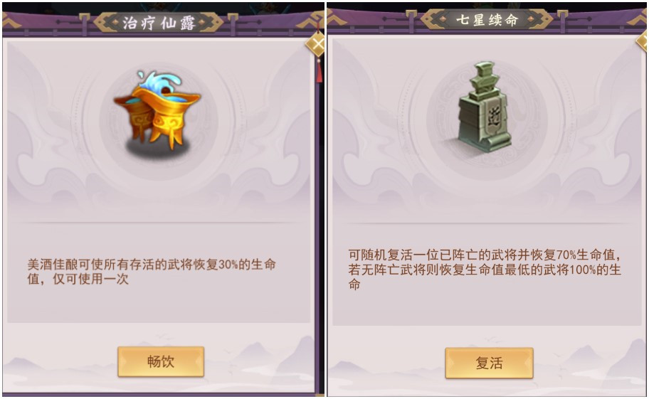 治疗仙露可以恢复全武将30%的生命值,用于群体补血。