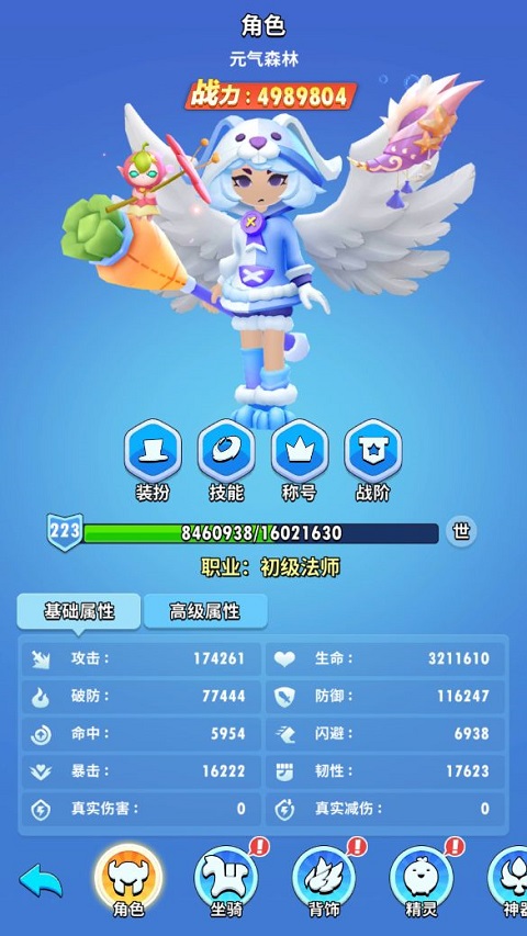 角色主要展示了角色的战力、等级、属性等。其中,属性分为基础属性与极品属性: